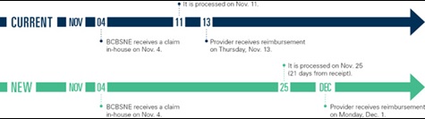 Starting Nov. 1, each weekly batch claims payment will be comprised only of claims with receipt dates of at least 21 days. We are also shifting the weekly payment settlement date from Thursdays to Mondays. This change applies to all BCBSNE lines of business, excluding the Federal Employee Program (FEP).
